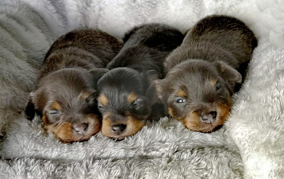 Zhanovi narodila tři štěňátka . Černá s pálením a modrá s pálením