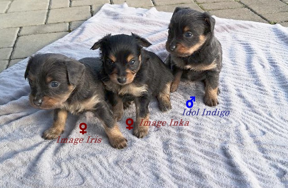Ve vrhu jsou dvě fenky, modrá s pálením a černá s pálením . Chlapeček je modrý s pálením